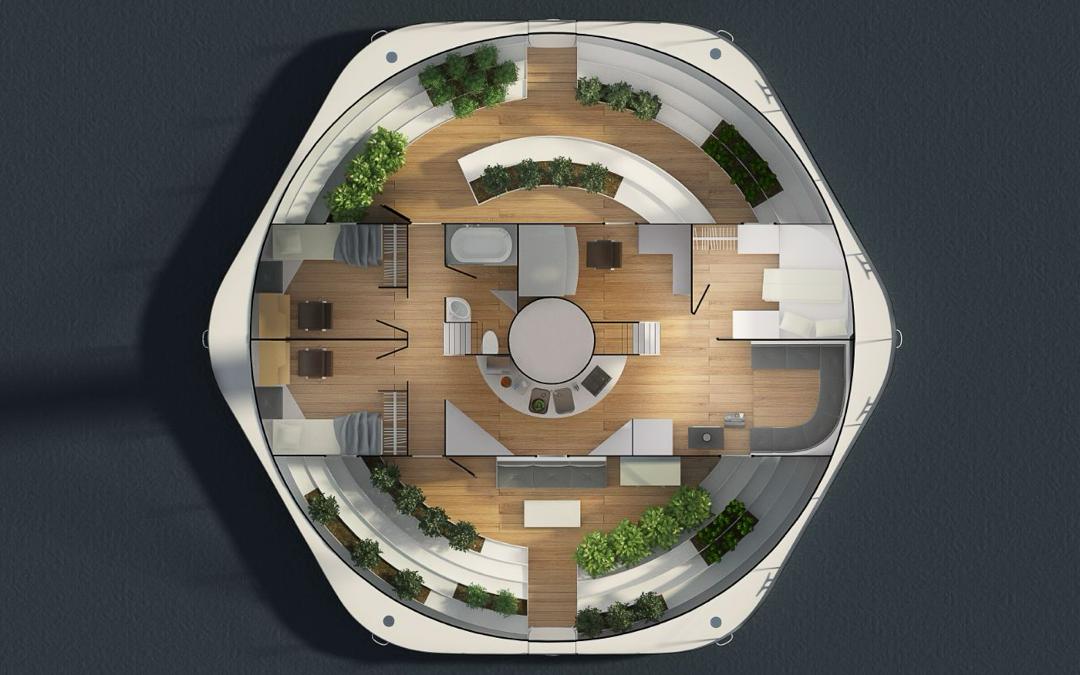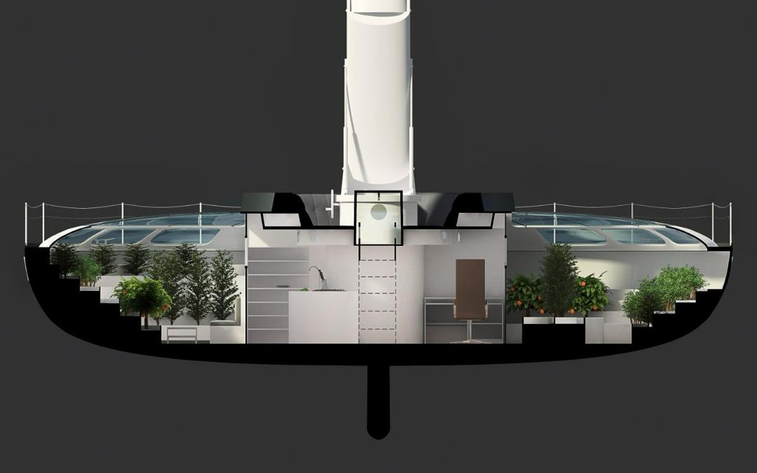 The sole of the "Alternative" is made of 24 separate sectors . Each sector is broken into 3 water tight compartments accessible through (8" ~20cm) water tight deck plates . The outer most shallow tank of each sector is used for water to heat or to cool the interior. The remaining tanks are used for dry storages , additional water tanks or other uses.
